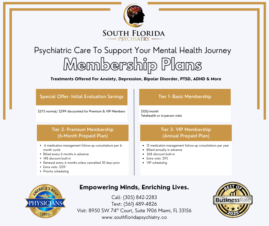 South Florida Psychiatry provides high-quality, integrative psychiatric care for adults and children in and around Miami, Florida. Our providers take a blended approach to managing various mental health disorders and behavioral health conditions. Our providers personalize care plans for mental health disorders, including anxiety, bipolar disorder, depression, and post-traumatic stress disorder (PTSD). They also diagnose and treat developmental disorders like attention-deficit hyperactivity disorder (ADHD) in kids and adults.